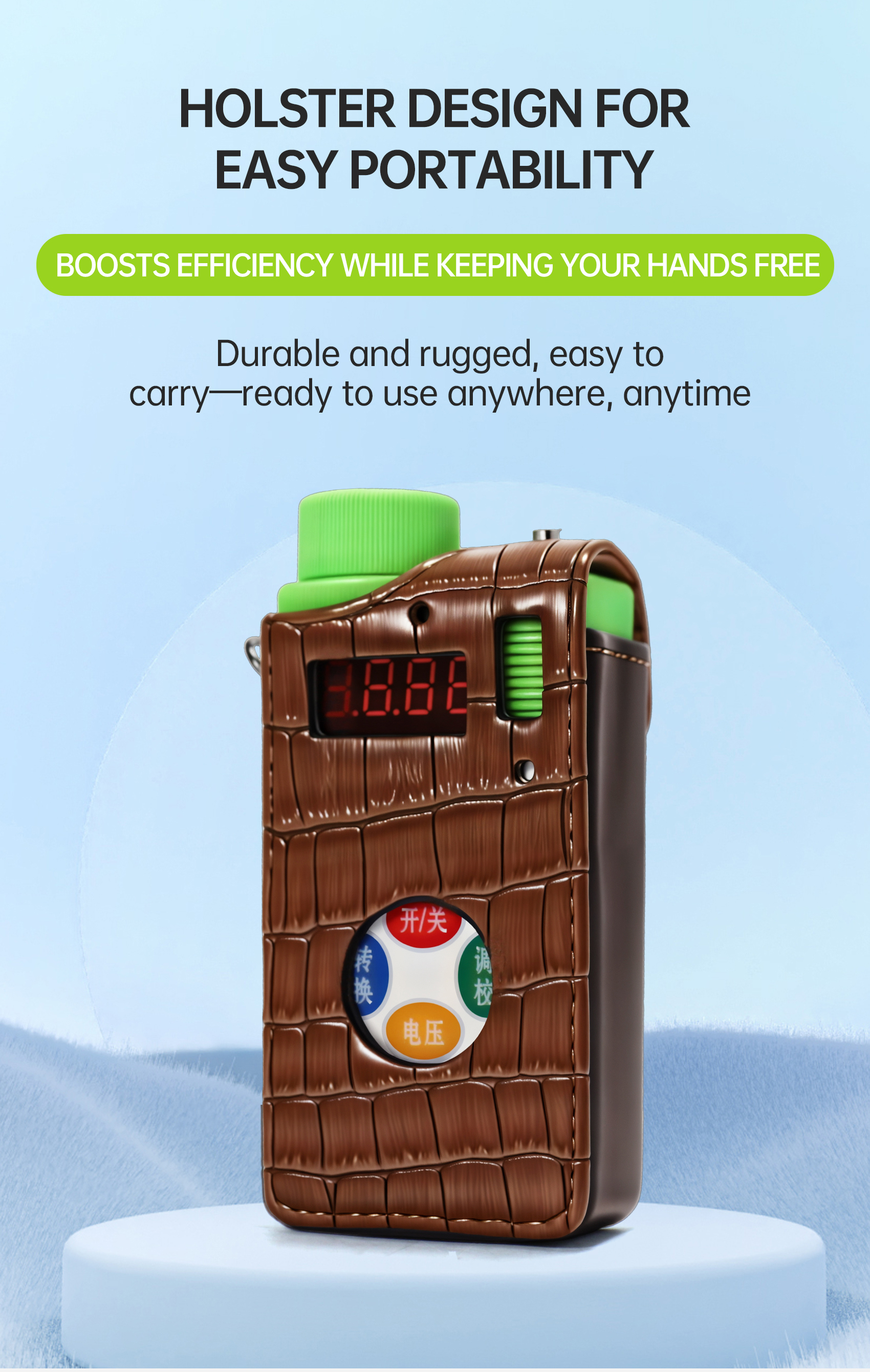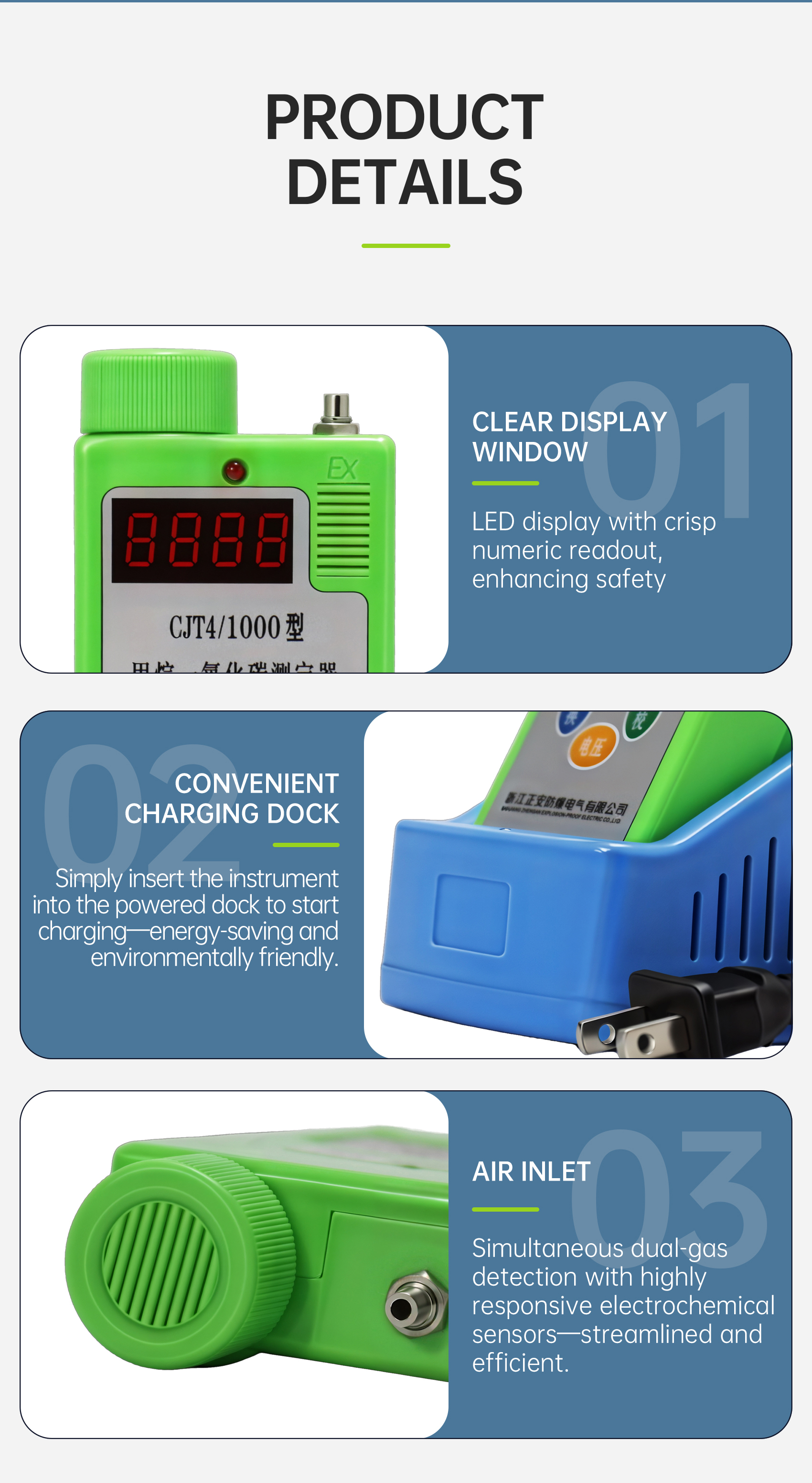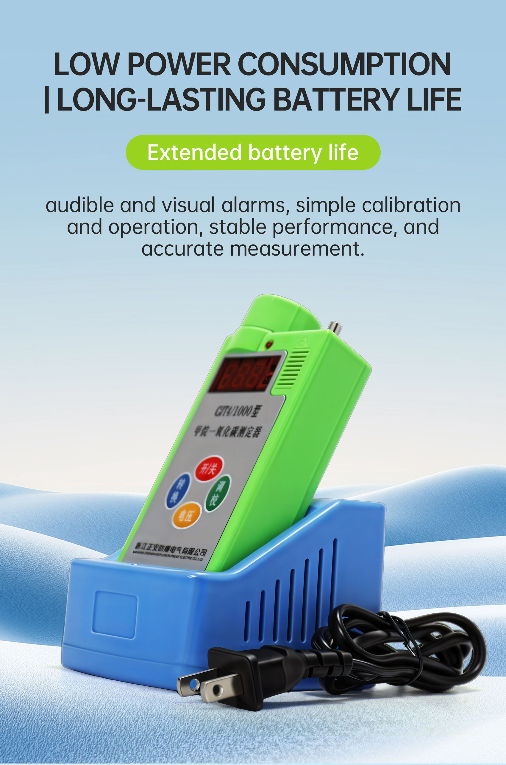 audible and visual alarms, simple calibration and operation, stable performance, and accurate measurement.