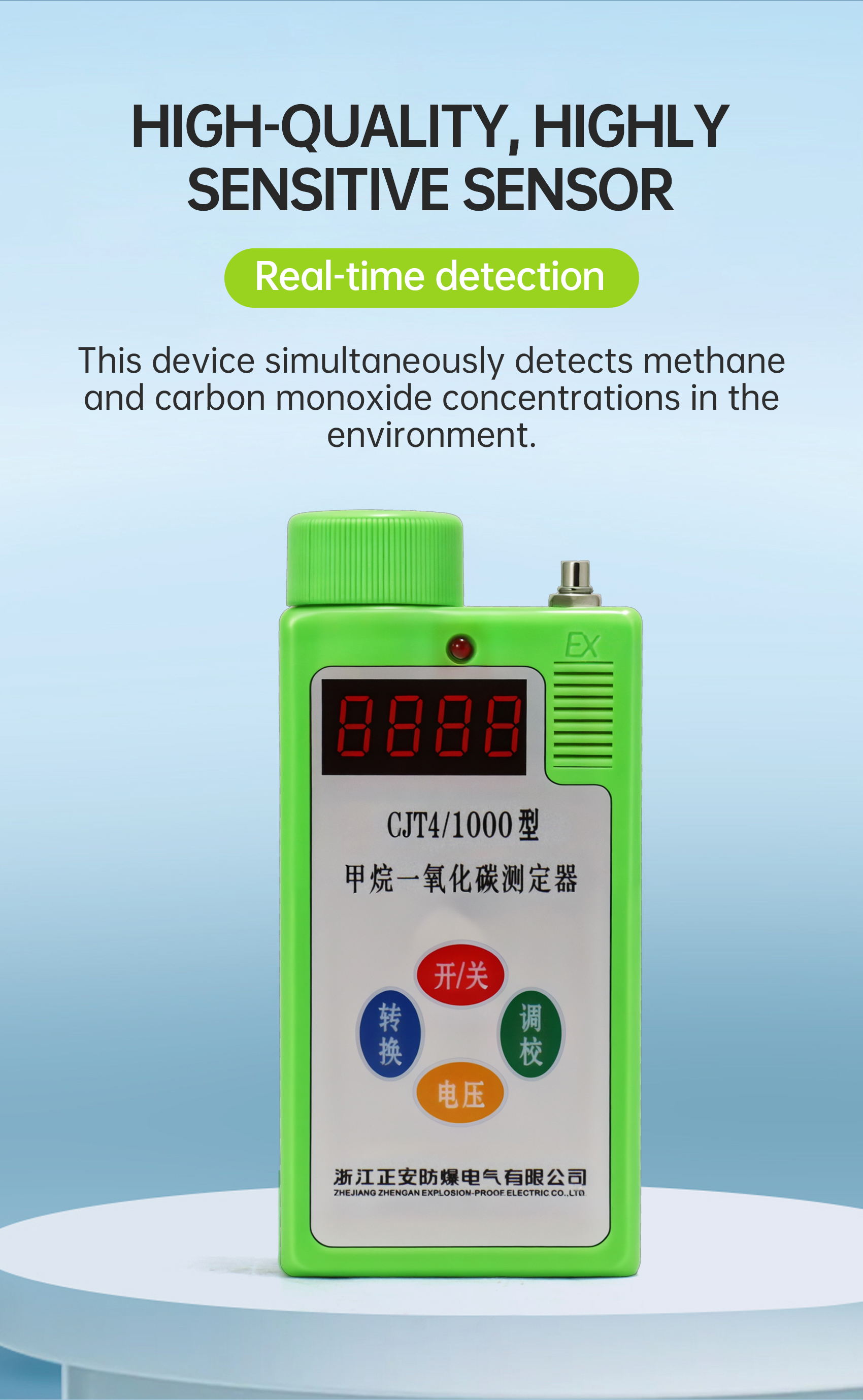This device simultaneously detects methane and carbon monoxide concentrations in the environment.