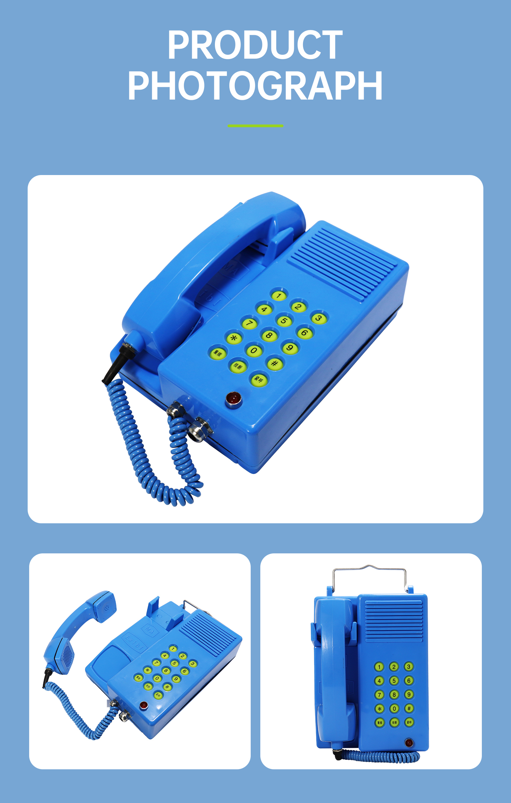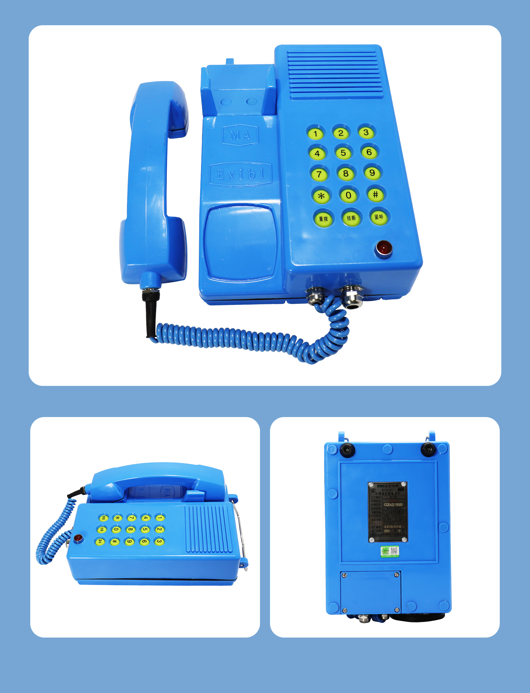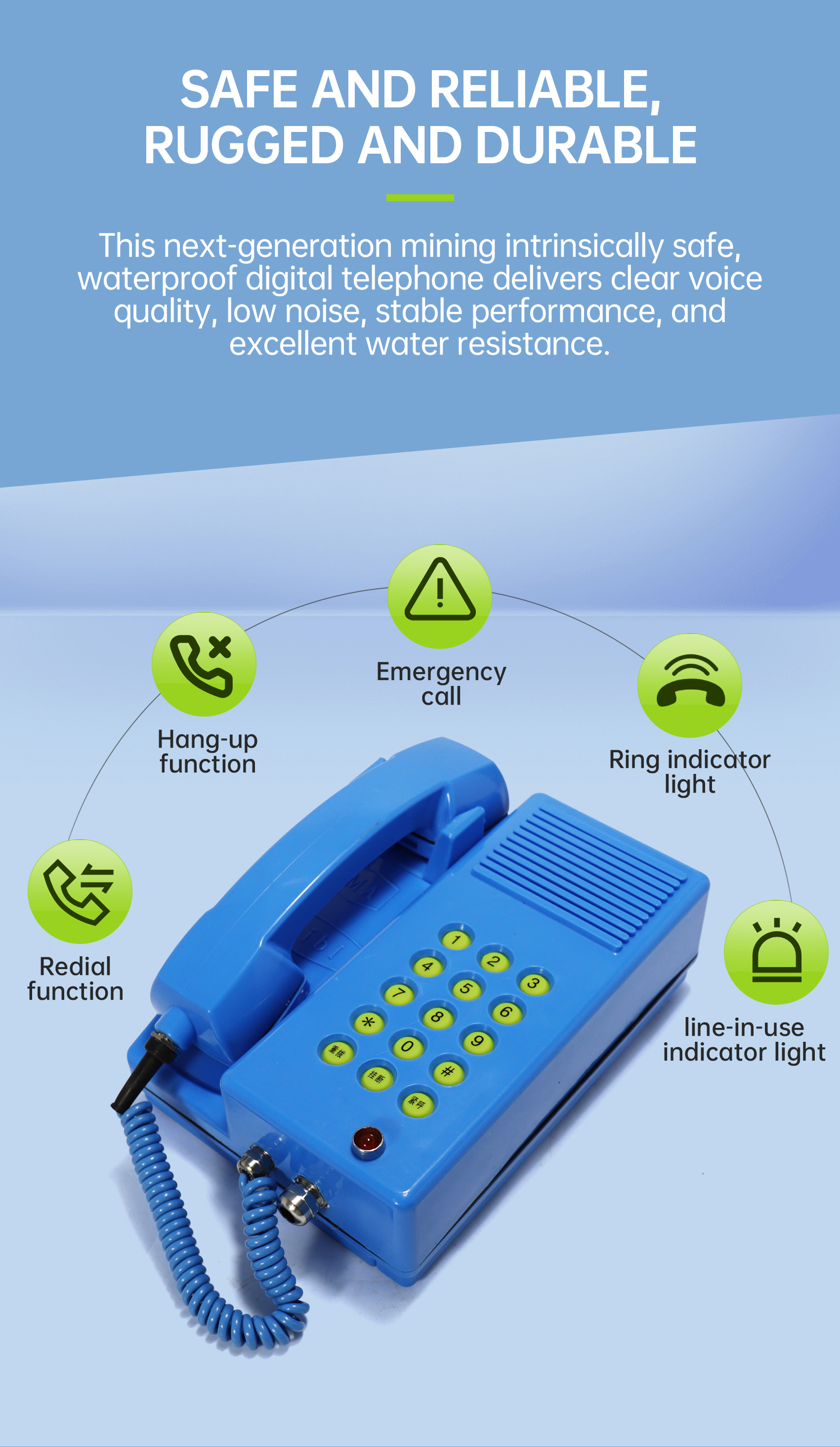 This next-generation mining intrinsically safe, waterproof digital telephone delivers clear voice quality, low noise, stable performance, and excellent water resistance.