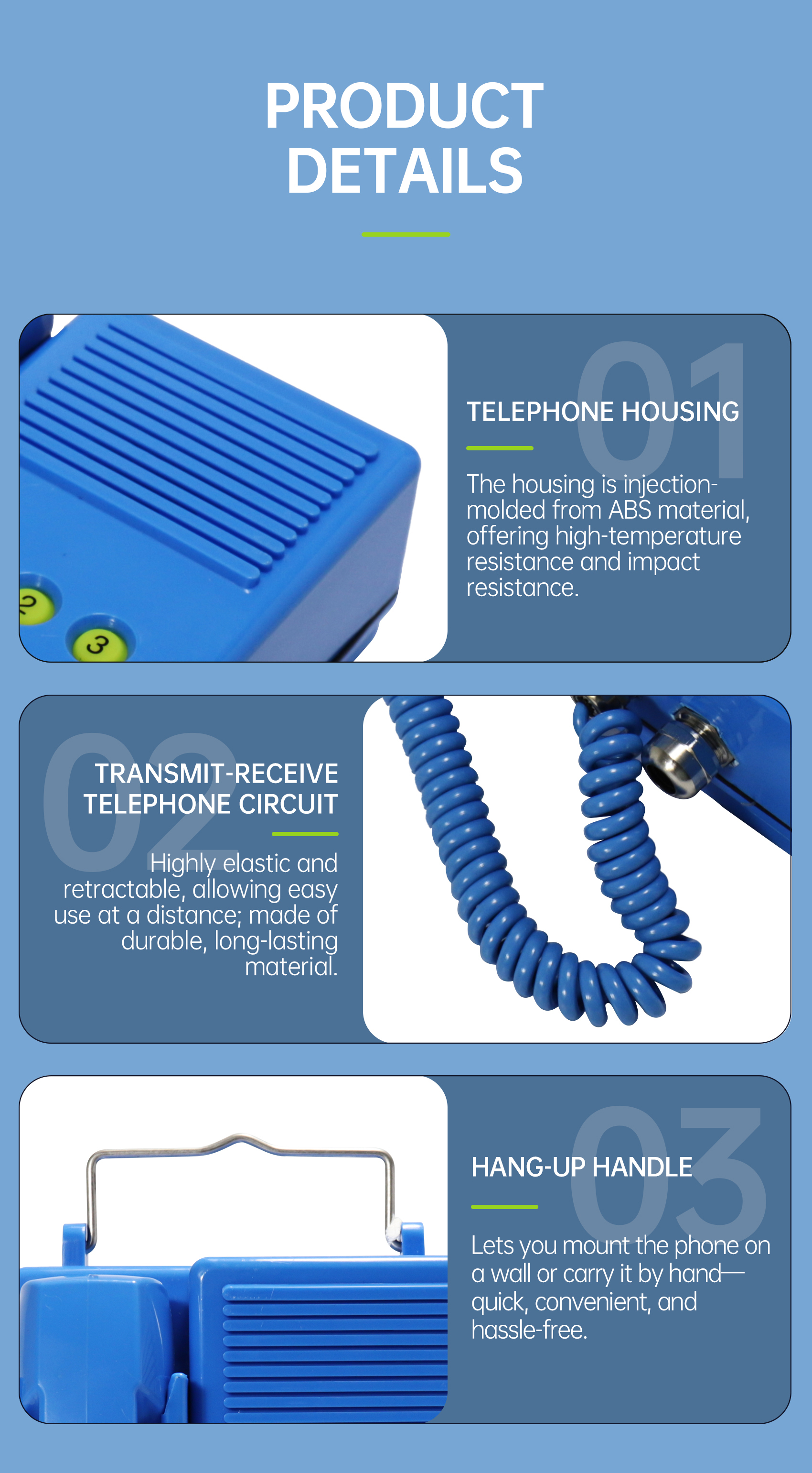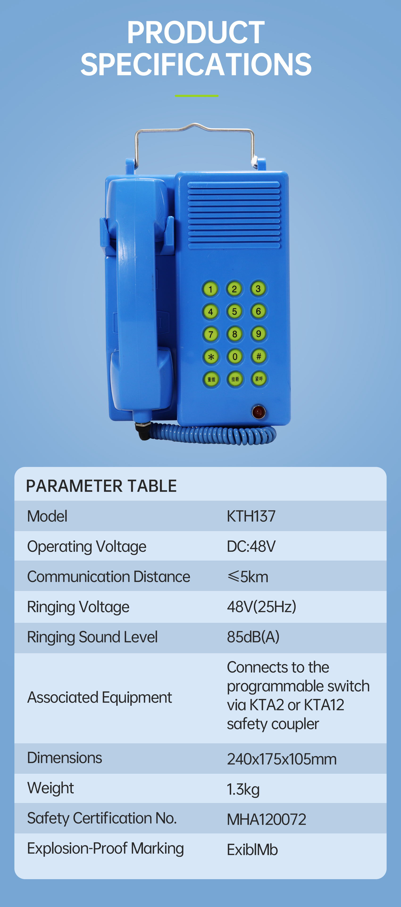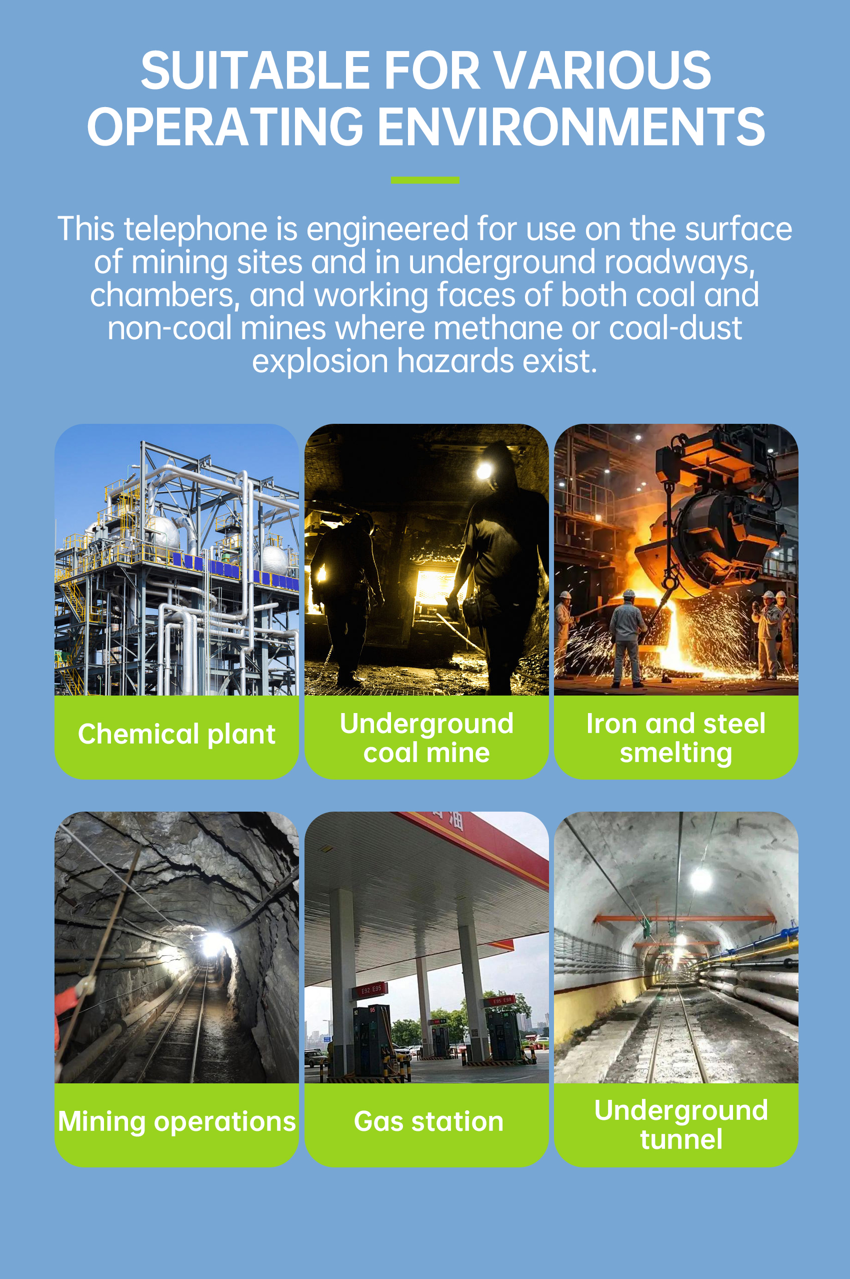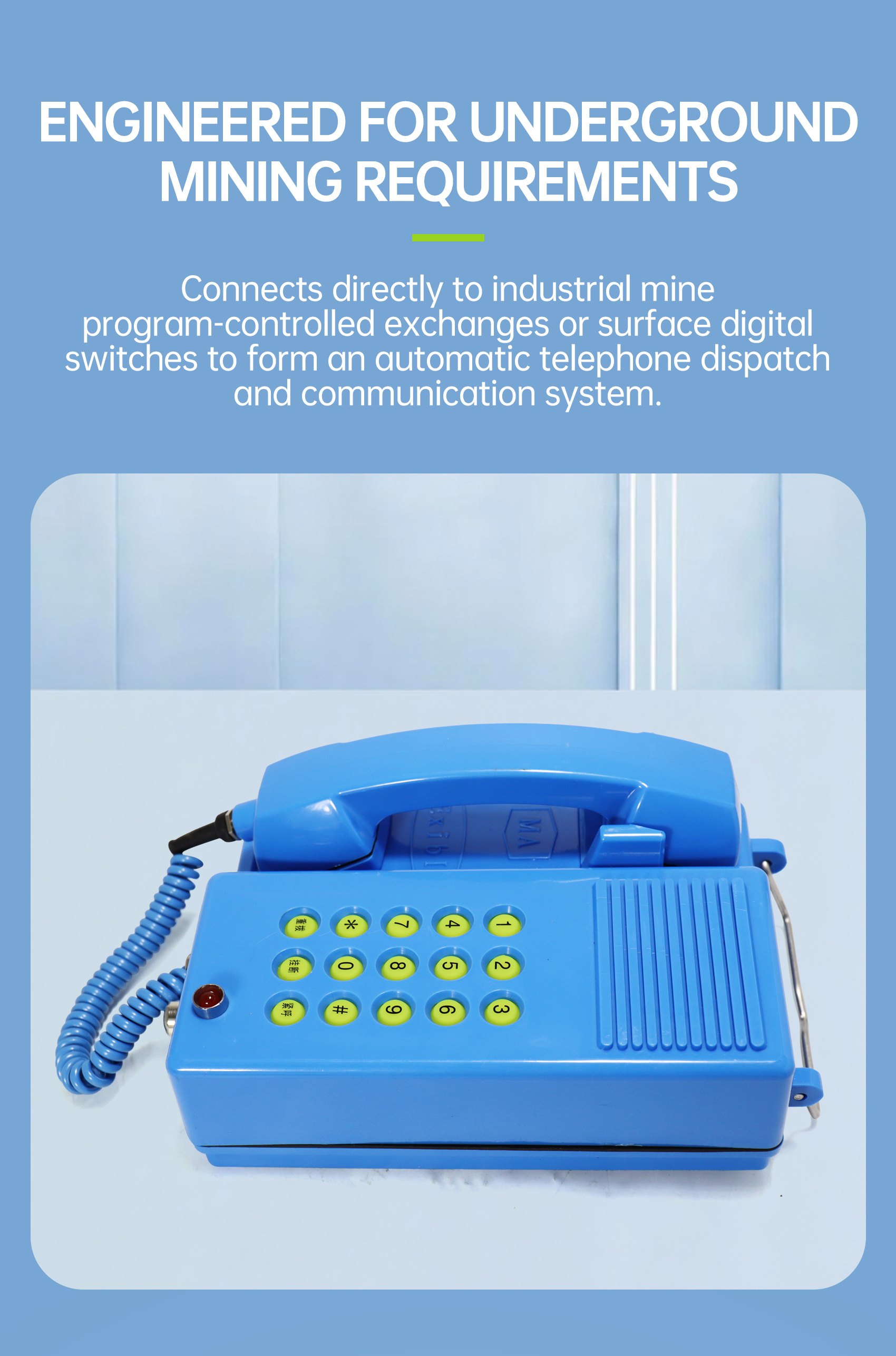 This telephone is engineered for use on the surface of mining sites and in underground roadways, chambers, and working faces of both coal and non-coal mines where methane or coal-dust explosion hazards exist.